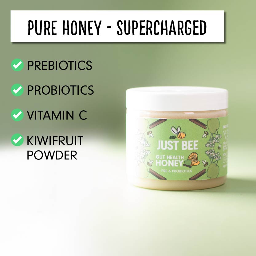 Your daily spoonful of gut-ness. Gut Health Honey is a delicious Apple & Cinnamon flavoured honey blend, designed to support digestive wellness — naturally. It combines our premium Acacia honey with scientifically proven probiotics, prebiotic-rich chicory root fibre, digestive-friendly kiwifruit extract and vitamin C to support your everyday gut health and immunity.